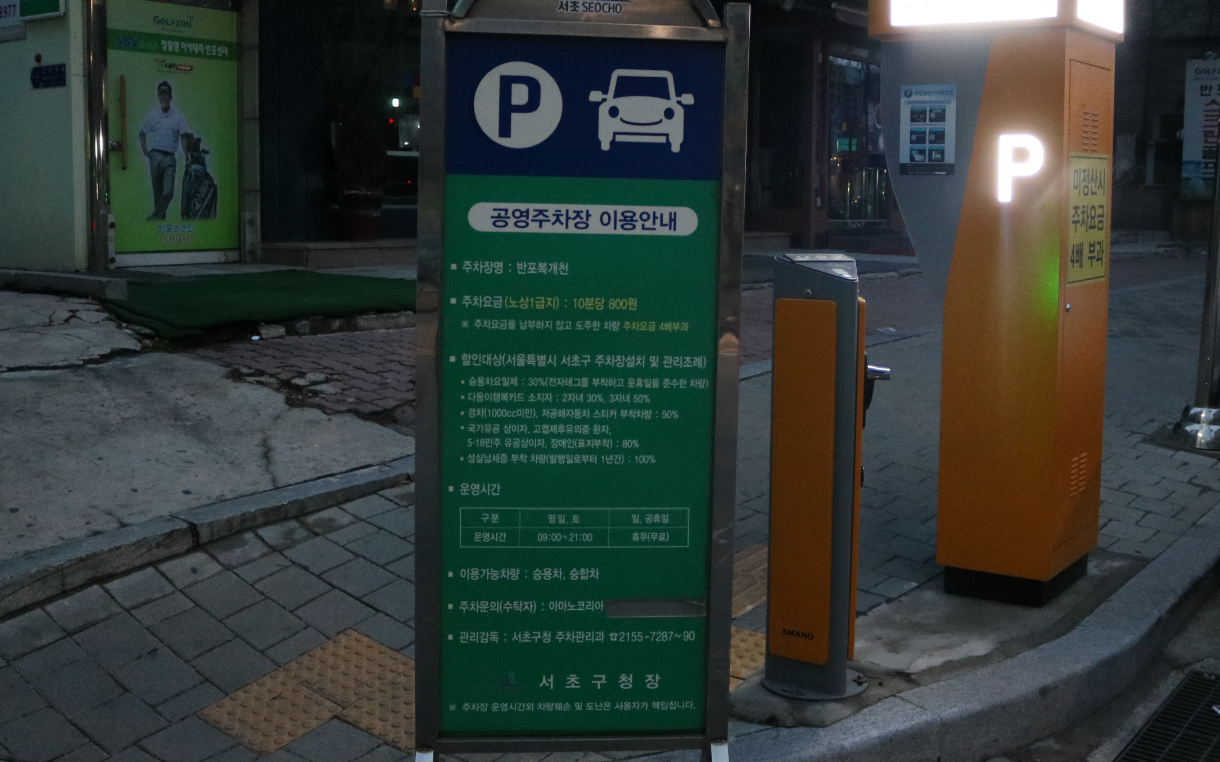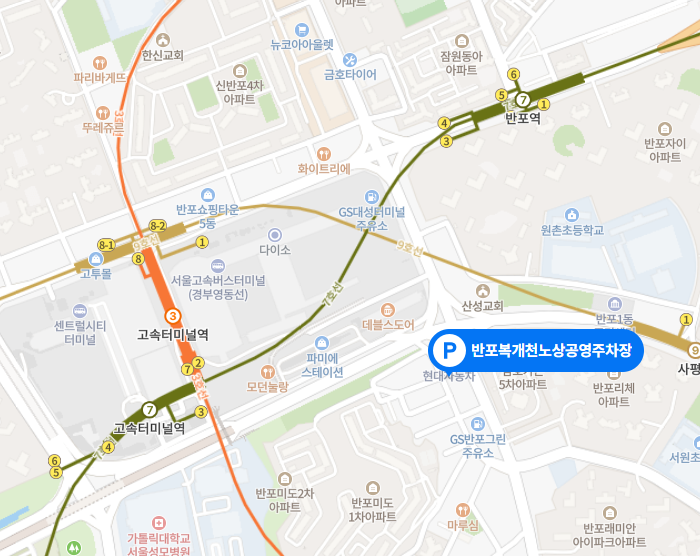 앞서 파미에 주차장하고 햇갈릴수 있으나 엄연히 다른 주차장이다. 이 주차장은 24시간 이용가능하며 약간 떨어져있다. 5분당 440원에 이용가능하며 찾아갈 경우 사평대로 205 반포천 복개주차장을 검색해서 찾아가면 된다. 고속터미널역 7호선 3번출구/ 3호선 2번출구 에서 286미터 떨어져있다.