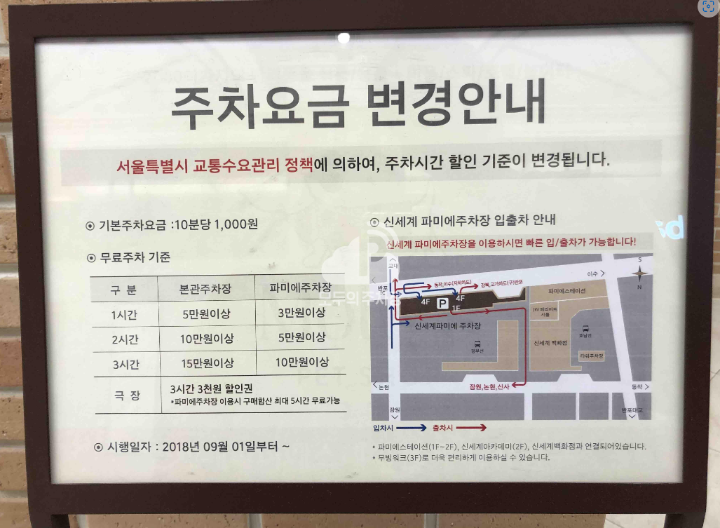 10분에 1,000원 이용가능하다. 하루 최대 일주차는 144,000이다. 빠른 입출차를 위해서는 파미에로 들어가는것이 좋다. 다만 어느 매장을 이용하느냐에 따라 무료혜택이 달라지는데 본관을 이용시에는 5만원 이용시 1시간 무료, 그 이후로는 5만원마다 1시간씩 최대 3시간씩 할인이 된다. 파미에의 경우 3만원 5만원 10만원 구간별로 1~3시간 할인권이 제공된다. 극장의 경우 3시간에 3천원 이용이 가능한 할인권을 제공해주는데 합상하여 최대 5시간까지 무료이용이 가능하다.